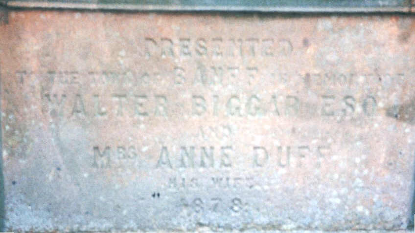 I. | Walter Biggar. Born Edinburgh 1787. Died 1867. Settled in Banff 1821 and founded the herring trade there. Married in Banff Anne Duff (born 1784, died 1876). There is a memorial to Walter and Anne which shows his crest on a shield and hers. | WB | |||||||||||||||||