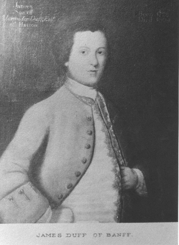 James Duff. Born about 1674. Died 1709. Married, betw 1696 - 1697 Jean Meldrum (born about 1681), dau of George Meldrum and Jean Duff. |